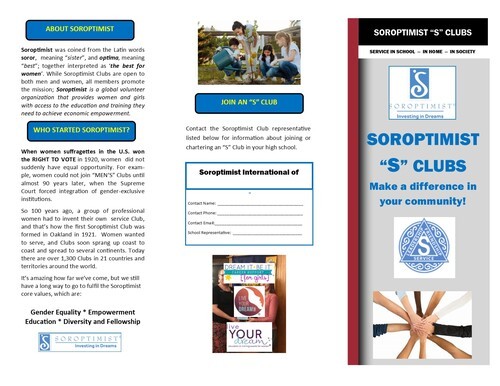 "S" Clubs are service clubs for high school students in our communities. They are considered "projects" of Soroptimist clubs. "S" clubs are a vital part of the high school extracurricular groups and are a great way for high school students to learn about serving others and helping in the community. The "S" clubs in Founder Region focus on helping women and girls improve their lives through programs leading to social and economic empowerment.